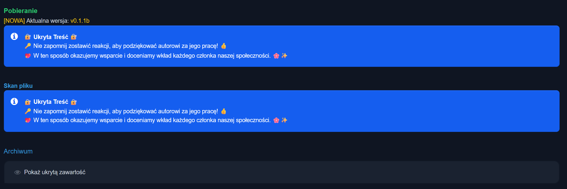 Hej, naturalnie, jestem bardzo wdzięczny za początkowy rozgłoś dla bota, który uzyskałem w większości dzięki temu forum. Jako że do DC jestem podłączony 24/7 to tam informacje i aktualizacje są najszybciej i gdy dostanę info że wszystko działa dobrze od przynajmniej kilku użytkowników to wrzucam aktualizację na forum.