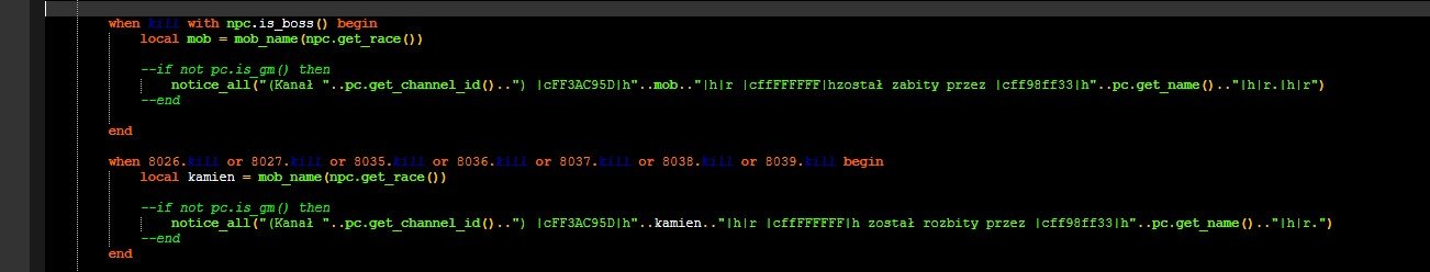 Probówalem naprawde na z 10 roznych sposób i to co sie dowiedzialem, czy moze inaczej, to co wydaje mi sie ze dziala to napewno notice_all bo juz mam uzytą te linijke w innym skrypcie z lvlup info, wiec ona chyba jest dobrze napisana, nastepnie zauwazylem ze piszac when kill na koncu musi byc with, nie dokonca jestem pewny ale z moich testów chyba wlasnie tak.
