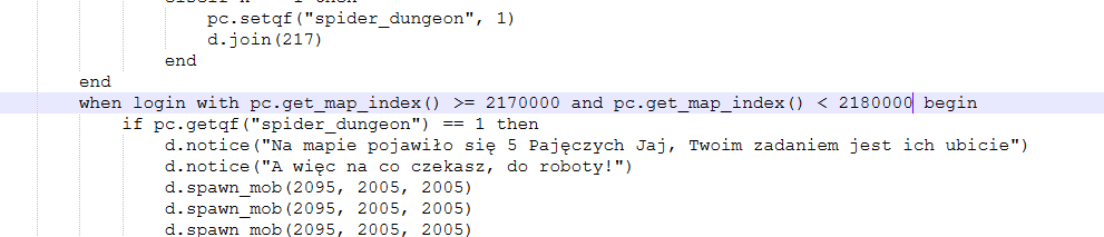 Opublikowano 7 Czerwca 20257 Cze Autor 21 minut temu, ExoCarossa napisał(a):Masz tutaj przykładowego questa na baronównę, nie patrzymy obecnie na to czy quest jest idealny czy też gówniak z 1368 roku.Nie wiem jak martysama ustawił indexy map ale to powinieneś ogarnąć, z rzeczy które są must have:when 20095.chat."Baronowa Pająków - 125" begin ➡️ po naciśnięciu na NPC o id 20095 zobaczysz misję o tej nazwie.if pc.get_level() <= 125 then ➡️ tutaj ustawiasz poniżej którego poziomu nie wejdziesz na dungawhen login with pc.get_map_index() >= 220000 and pc.get_map_index() < 230000 begin ➡️ tutaj cyfry podajesz zależne od tego na jakim id jest ta mapa, w moim przypadku d.join(22). Jeżeli masz np. 236 to podmieniasz 22 na 236 i 23 na 237d.join(22)➡️id mapyspider_dungeon.questquest spider_dungeon_v3 begin state start begin when 20095.chat."Baronowa Pająków - 125" begin --local czas = pc.getqf("time3") --local ch = pc.get_channel_id() --local lv = pc.get_level() say_title("Stażec:") say("Witaj "..pc.get_name()..".") say("Komnata pająków to bardzo nie bezpieczne") say("miejsce, z którego nie wraca dużo wojowników") say("znim tam się wybierzesz zainwestów w dobry") say("ekwipunek i pro buffa, co mam tu gadać więcej") say("żegnam i życzę powodzenia.") say("Aby wejśc potrzebujesz:") say("- Minimum 125 Poziom postaci") wait() if pc.get_level() <= 125 then syschat("[Baronowa Pająków] Nie posiadasz minimum 125 Poziomu postaci.") return end say_title("Stażec:") say("A więc na pewno chcesz?") say("") local x = select("Tak", "Nie") if x == 2 then return elseif x == 1 then pc.setqf("spider_dungeon", 1) d.join(22) end end when login with pc.get_map_index() >= 220000 and pc.get_map_index() < 230000 begin if pc.getqf("spider_dungeon") == 1 then d.notice("Na mapie pojawiło się 5 Pajęczych Jaj, Twoim zadaniem jest ich ubicie") d.notice("A więc na co czekasz, do roboty!") d.spawn_mob(2095, 357, 577) d.spawn_mob(2095, 378, 578) d.spawn_mob(2095, 376, 598) d.spawn_mob(2095, 357, 596) d.spawn_mob(2095, 367, 585) syschat("[Baronowa Pająków] Pajęcze Jaja się pojawiły!") timer("regen",60*20) end end when regen.timer begin d.regen_file("data/dungeon/spider_dungeon_regen.txt") timer("Exit", 60*20) end when kill with npc.get_race() == 2095 and pc.get_map_index() >= 220000 and pc.get_map_index() < 230000 begin d.setf("Pajeczy_Metin_5", d.getf("Pajeczy_Metin_5")+1) if d.getf("Pajeczy_Metin_5") >= 5 then syschat("[Baronowa Pająków] Krol Pajakow walczy jako obrońca Jaj!") d.spawn_mob(2094, 367, 588) d.setf("Pajeczy_Metin_5", 0) end end when kill with npc.get_race() == 2094 and pc.get_map_index() >= 220000 and pc.get_map_index() < 230000 begin syschat("[Baronowa Pająków] Pokonales Krola Pajakow, waszym zadaniem jest pokonanie Baronowej!") d.spawn_mob(2092, 367, 588) end when kill with npc.get_race() == 2092 and pc.get_map_index() >= 220000 and pc.get_map_index() < 230000 begin timer("Exit_Z", 30) notice_all("Gracz ".. pc.get_name() .." z poziomem ".. pc.get_level() .." zabił Baronowne!") syschat("[Baronowa Pająków] Baronowa Pająków została pokonana, macie 30 Sekund!") end when Exit.timer begin syschat("[Baronowa Pająków] Pozostało 15 Sekund do powrotu do miasta!") syschat("[Baronowa Pająków] Pozostało 15 Sekund do powrotu do miasta!") syschat("[Baronowa Pająków] Pozostało 15 Sekund do powrotu do miasta!") syschat("[Baronowa Pająków] Pozostało 15 Sekund do powrotu do miasta!") syschat("[Baronowa Pająków] Pozostało 15 Sekund do powrotu do miasta!") syschat("[Baronowa Pająków] Pozostało 15 Sekund do powrotu do miasta!") syschat("[Baronowa Pająków] Pozostało 15 Sekund do powrotu do miasta!") timer("Exit_X", 15) end when Exit_X.timer begin d.kill_all() d.exit_all() end when Exit_Z.timer begin d.kill_all() d.exit_all() end endendDość łatwe rzeczywiscie, tylko nie do końca rozumiem skąd mam znalezc te mape, czy ja ją posiadam domyslnie rowniez w plikach?
